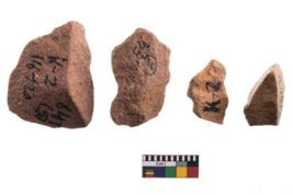 | Description / विवरण | Specimen of flake tools with prominent flaking marks. Made up of a short flakes with sides trimmed. |