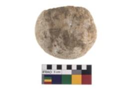 | Description / विवरण | Partially broken specimen of a hammer stone with battered surface made from quartz |