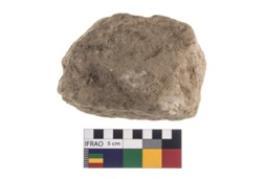 | Description / विवरण | Partially broken specimen of a hammer stone with battered surface made from quartz |