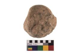 | Description / विवरण | A partially broken specimen of roughly round shaped hammer stone with battered periphery along with the circumference. |