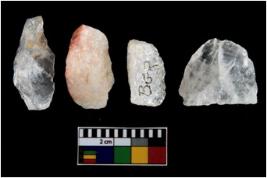 | Description / विवरण | There are n-4 of intact utilized flakes made up of Quartz. Some of them have bulge of percussion and some are flat flakes. |