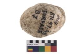 | Description / विवरण | Partially Broken specimen of a hammer stone without battered surface made from quartz |