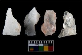 | Description / विवरण | There are n-4 of intact utilized flakes made up of Quartz. Some of them have bulge of percussion and some are flat flakes. |