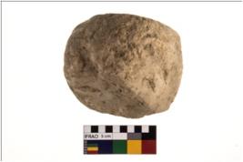 | Description / विवरण | A partially broken specimen of oval shaped muller. It has battered surface along with ridges and roughly oval in section without any holding ends, thick. It is made up of quartz. |