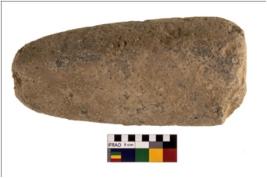 | Description / विवरण | A complete specimen of oval shaped muller. It has battered surface along with ridges and roughly oval in section with prominent end, thick. It is made up of sandstone. The ridges are curved. |