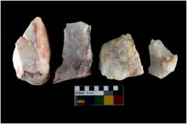 | Description / विवरण | There are n-4 of intact utilized flakes made up of Quartz. Some of them have bulge of percussion and some are flat flakes. |