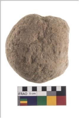| Description / विवरण | A partially broken specimen of roughly round shaped and flattish hammerstone with battered periphery along with the circumference. It is flat at one end. It is made up of quartz. |