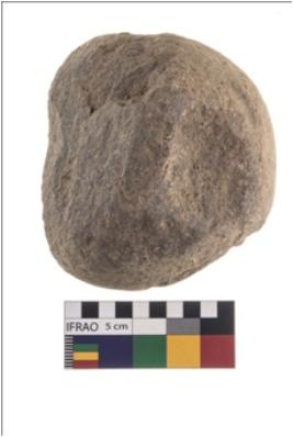 | Description / विवरण | A partially broken specimen of roughly round shaped hammerstone with battered periphery along with the circumference. It is broken from middle portion. It is made up of red sandstone. |