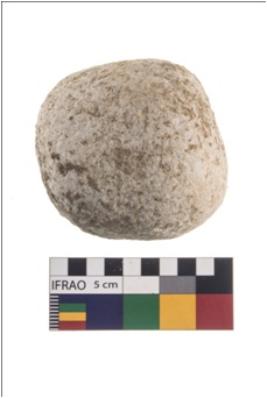 | Description / विवरण | A complete specimen of roughly globular shaped and flattish slingball with battered periphery along with the circumference. It is flat on both ends. It is made up of quartz. |