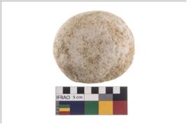 | Description / विवरण | A partially broken specimen of round shaped and flattish hammerstone with battered periphery along with the circumference. It is flat at one end and broken from middle portion. It is made up of quartz. |
