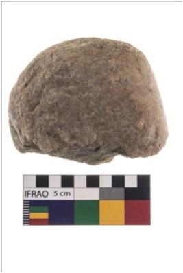 | Description / विवरण | A partially broken specimen of roughly round shaped and flattish hammerstone with battered periphery along with the circumference. It is flat at one end and broken from middle portion. It is made up of quartz. |
