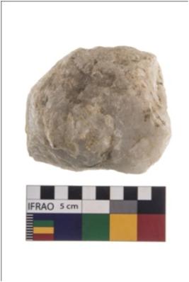 | Description / विवरण | A partially broken specimen of roughly round shaped hammerstone with battered periphery along with the circumference. It is used on all sides as the hammerstone almost broken. It is made up of quartz. |