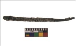 | Description / विवरण | A partially broken specimen of slightly curved shaped copper rod. It is bulbous at one end and having round edges. It is heavily corroded and very fragile in nature. Probably it is an antimony rod. |