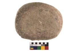 | Description / विवरण | A partially broken specimen of a oval shaped muller stone with oval section. Prolonged used leads to a rounding and smoothening of the surface of the artifact. |
