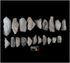 | Description / विवरण | There are n-20 of intact flake cores made up of Quartz. Some of them have bulge of percussion and some are flat flakes. |