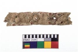 | Description / विवरण | A partially broken specimen of a copper impressed strip. It is having a design on it, It is corroded |