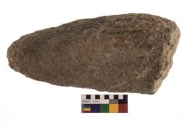 | Description / विवरण | A Partially broken specimen of a oval shaped pounder stone with Oval section.It heaving battered surfaced and truncated end to hold the object. |