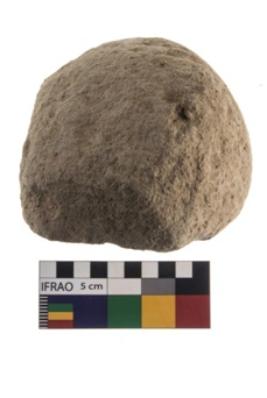 | Description / विवरण | A partially broken specimen of roughly round shaped hammer stone with battered periphery along with the circumference. |