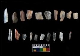 | Description / विवरण | There are 20 objects out of which which 11 are made out of quartz and 9 are made out of chert. Out of the objects there are 8 blades and 12 debitage. |