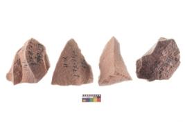 | Description / विवरण | Four worked utilised flakes. Many a times tapering and pointed at one end. |