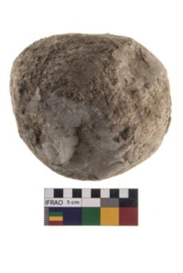 | Description / विवरण | A partially broken specimen of roughly round shaped hammer stone with battered periphery along with the circumference. |