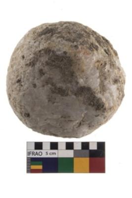 | Description / विवरण | A partially broken specimen of roughly round shaped hammer stone with battered periphery along with the circumference. |