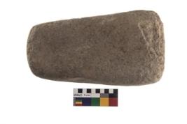 | Description / विवरण | A partially broken specimen of a oval shaped muller stone with battered surfaced and truncated end to hold the object. |