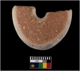 | Description / विवरण | A partially broken specimen of terracotta perforated disc made from a Black and Red ware sherd slipped on both sides. The slip has eroded from the area around the perforation and diameter edge. The outer edge is uneven. It is wheel-made with well-levigated clay. It is quite light-weight. It is having smooth surface and well fired. |