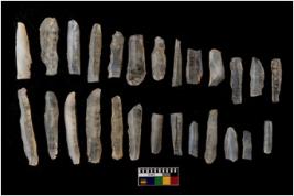 | Description / विवरण | 25 Chalcedony blades which has penknife,blunted back and used ,unused, rejuvenating Parallel sided flakes |