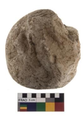 | Description / विवरण | A partially broken specimen of roughly round shaped hammer stone with battered periphery along with the circumference. |