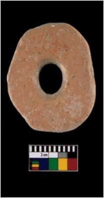 | Description / विवरण | A partially broken specimen of terracotta spindle whorl. It has eroded from the area around the perforation and diameter edge. The outer edge is uneven. It is wheel-made with well-levigated clay. It is quite light-weight. It is reddish in colour and well fired. |