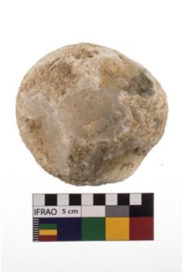 | Description / विवरण | A Hammer stone roughly rounded in shape with grounded edges. |