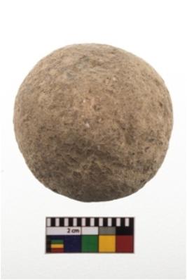 | Description / विवरण | A partially broken speciemen of stone sling ball, small in size, flat base and with smooth surface. |