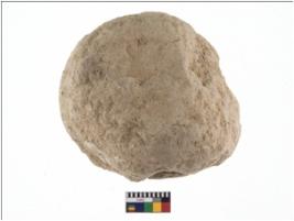 | Description / विवरण | A partially broken specimen of roughly round shaped hammerstone with battered periphery along with the circumference. It is flat at one end and broken from the other portion. It is made up of quartz. |