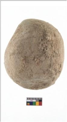 | Description / विवरण | A complete specimen of roughly round shaped hammerstone with battered periphery along with the circumference. It is flat at one end and broken from the other portion. It is made up of quartz. |
