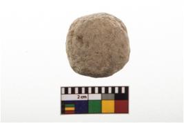 | Description / विवरण | A partially broken speciemen of stone sling ball, small in size, flat base and with smooth surface. |