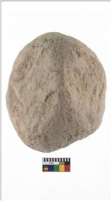 | Description / विवरण | A partially broken specimen of spherical shaped hammerstone with battered periphery along with the circumference. Its shape is a nearly sphere with minimal scratches and pits.. It is flat from one of ends. It is made up of sandstone. |