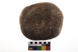 | Description / विवरण | The object is Hammerstone of material Sandstone. It is some what flat, tablet-shaped with battered periphery. |
