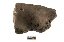 | Description / विवरण | A partially broken specimen of a saddle quern . It is roughly rounded in shape , was used for girnding various substances. |