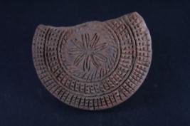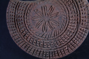 Circle shaped scrubber with floral and geometrical motifs, it is damaged.