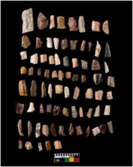 | Description / विवरण | 41 quertz,10 chacedony, 55 cherts. Out of which are 46 blades and rest are debitage. Those are with flat retouch, triangles, blunted back, obliquely truncated blades, crescents,trapezes, points and other tools |