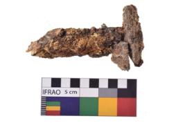 | Description / विवरण | A long Iron nail with pointed functional bottom end and round slightly projected top with loop shaped. |