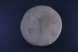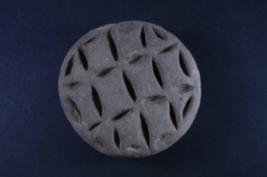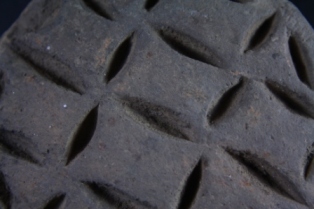 Circle shaped stamp has embossed design in the form of geometrical motifs.