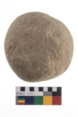 | Description / विवरण | A partially broken specimen of a hammer stone, with rough surface It is made of quartz it is roughly circular in shape, it is with battering marks. |