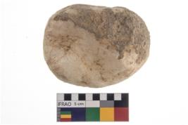 | Description / विवरण | A partially broken specimen of a hammer stone, with rough surface It is made of quartz it is roughly circular in shape, it is with battering marks. |