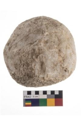 | Description / विवरण | A partially broken specimen of a hammer stone, with rough surface It is made of quartz it is roughly circular in shape, it is with battering marks. |