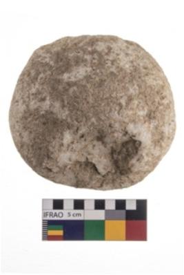 | Description / विवरण | A partially broken specimen of a hammer stone, with rough surface It is made of quartz it is roughly circular in shape, it is with battering marks. |