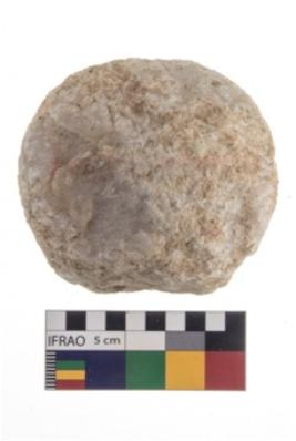 | Description / विवरण | A partially broken specimen of a hammer stone, with rough surface It is made of quartz it is roughly circular in shape, it is with battering marks. |