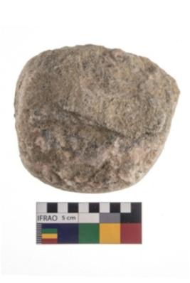 | Description / विवरण | A partially broken specimen of a hammer stone, with rough surface It is made of quartzite it is roughly rectangular in shape, it is with battering marks. |