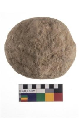 | Description / विवरण | A partially broken specimen of a hammer stone, with rough surface It is made of quartz it is roughly oblong in shape, it is with battering marks. |